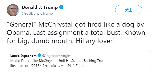 “麦克里斯特尔‘上将’像条狗一样被奥巴马开除。最后的任务一败涂地。出名的是他口齿不清的大嘴巴。希拉里的拥趸!”在转发一条关于题为“媒体不喜欢麦克里斯特尔直到他开始抨击特朗普”的新闻报道时,特朗普在其推特上这样写道。