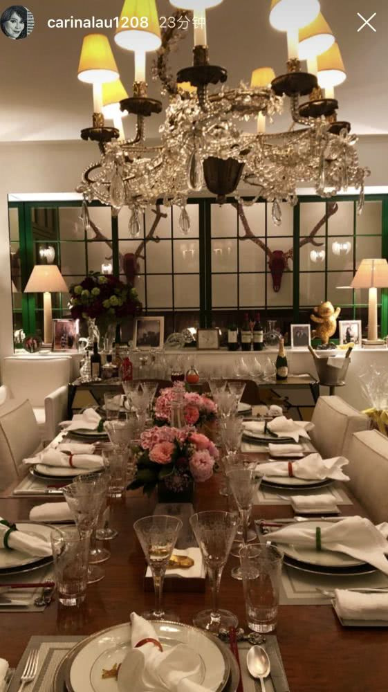 刘嘉玲公开了饭厅的照片,饭桌上已经摆好了餐具,看来当晚嘉玲姐准备宴客,而且她还拿出了至少十瓶酒,有红酒也有茅台……让宾客不醉无归!