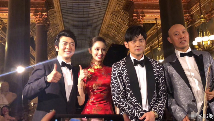 郎朗携妻子Gina Alice与周杰伦等友人合影,郎朗与Gina Alice非常默契的都比了“赞”的手势~