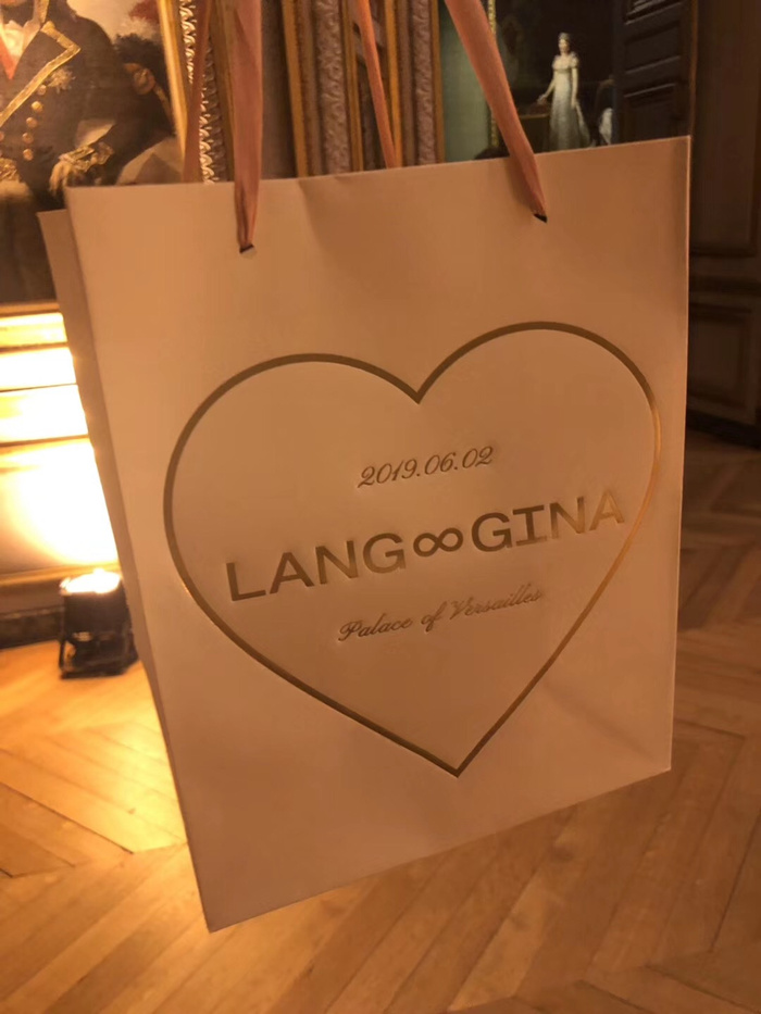 郎朗与Gina Alice的伴手礼曝光,袋子上印有一颗大爱心,爱心中则写有“LANG”和“GINA”的字样。