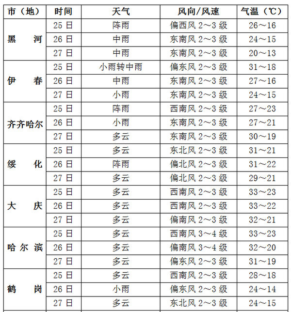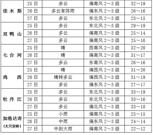 25日:大兴安岭、黑河、伊春、齐齐哈尔、绥化北部、佳木斯东部有雷阵雨,其中黑河东部、伊春北部局地有中雨。
