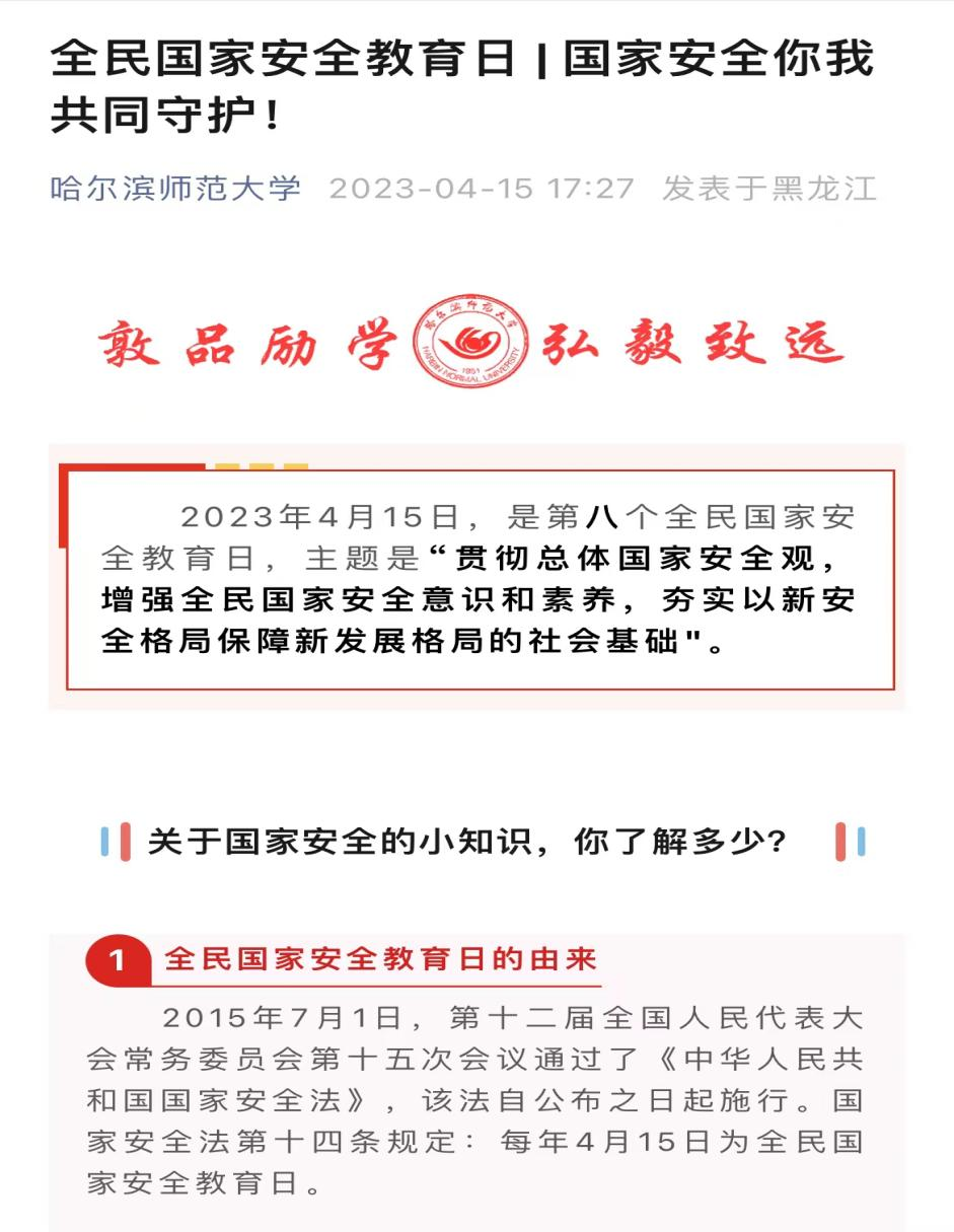 哈尔滨师范大学组织国家安全小知识线上学习问答活动,带领师生共同阅览学习。