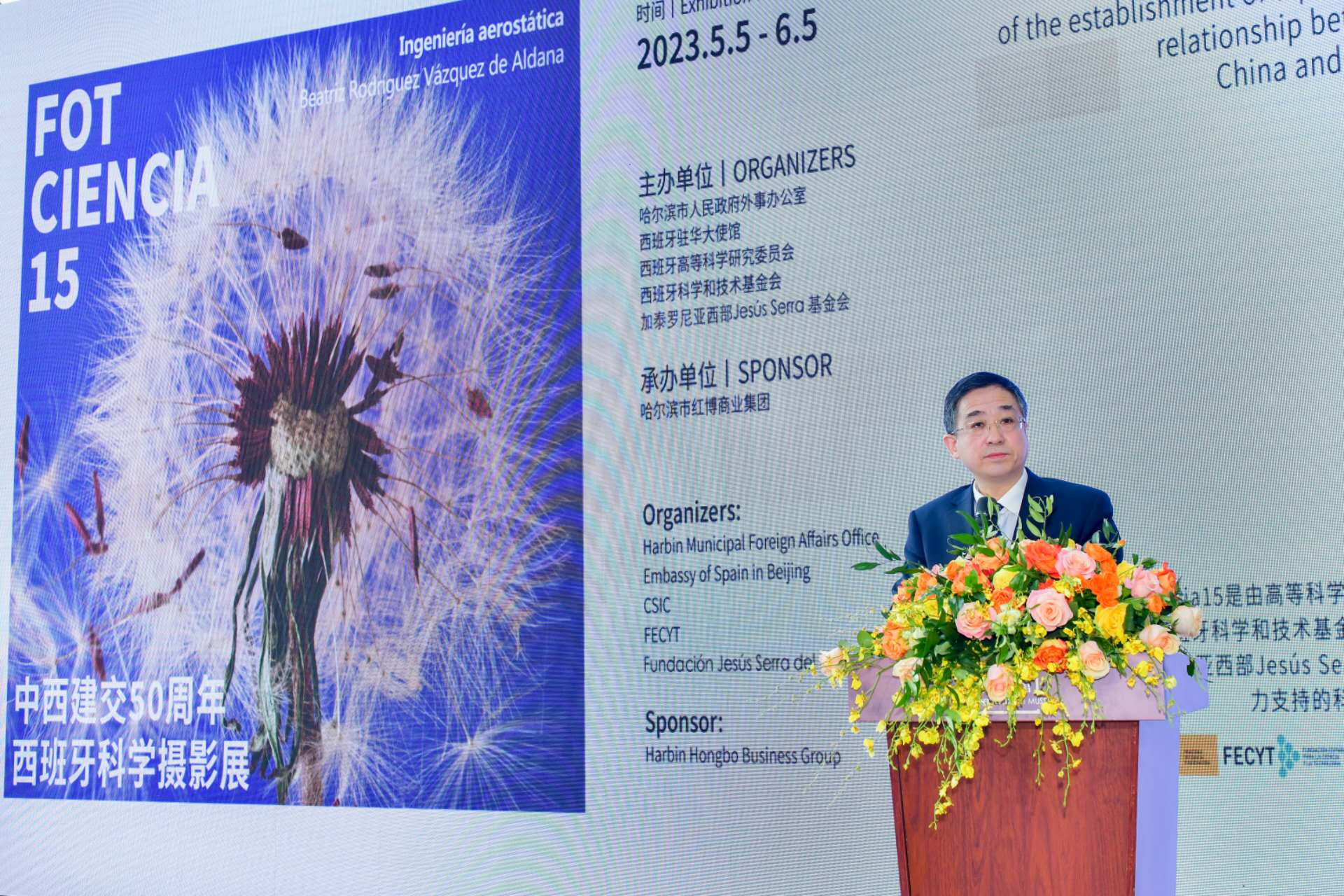 栾志成在致辞中表示,中国和西班牙全面战略伙伴关系不断深化,经贸、科技、人文等领域交流合作取得了丰硕成果。作为庆祝中西建交50周年系列活动之一的“西班牙科学摄影展”在哈尔滨市举办意义非凡,将为哈尔滨市民的文化科技生活带来全新体验,并为哈尔滨市打造“创新引领之都”“创意设计之都”注入新的活力。西班牙创意设计产业发达,哈尔滨市将充分对接西班牙优势资源,推动双方在科技创新、文化艺术、创意设计等领域开展务实合作。