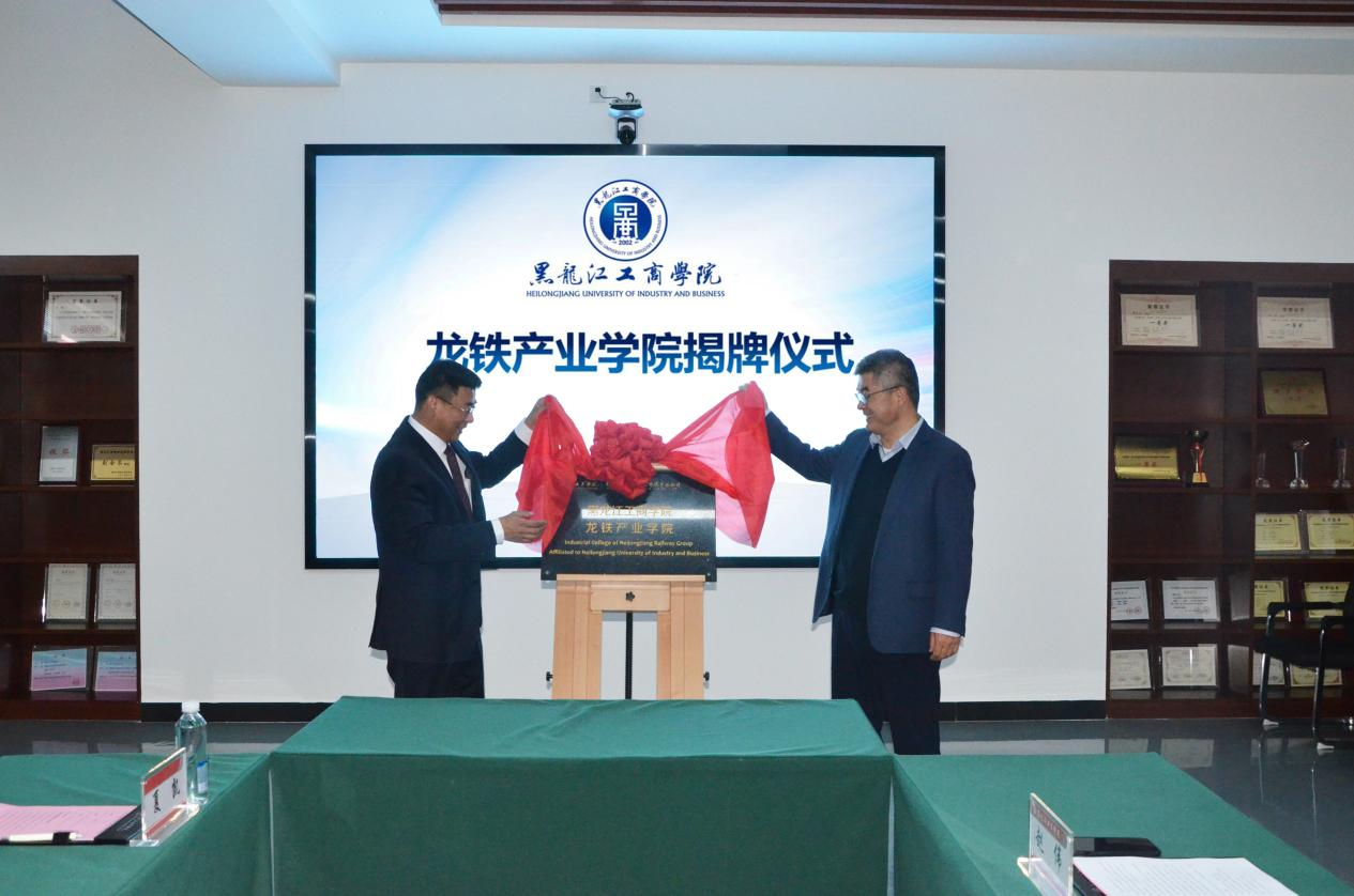 黑龙江网讯(记者 徐楠)5月11日,黑龙江工商学院龙铁产业学院正式挂牌成立,这是该校主动融入经济建设主战场,精准把握铁路行业产业用人需求,与黑龙江省铁路集团公司联合举办的省内首家培养铁路交通轨道类本科专业应用型人才的现代产业学院。黑龙江工商学院理事长刘来祥和黑龙江省铁路集团公司党委书记、董事长乔书成共同为“龙铁产业学院”揭牌。