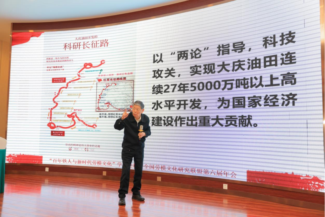 在主旨报告环节,大庆油田原总经理助理、副总地质师,人民楷模、改革先锋、新时期铁人王启民以《崇高的精神是伟大事业的灵魂》为题,结合经历和体会认为,铁人精神的形成是从思想到文化,从玉门到大庆,逐步递进、演化的过程,用三个字概括就是“战”“国”“闯”,即“战”字育人——艰苦奋斗、实践锤炼;“国”字扎根——担当使命、为油拼搏;“闯”字立业——钢铁井队、标杆旗帜。传承铁人精神,要懂得“国字扎根”,持之以恒不动摇,当好“开发闯将”,宁肯把心血熬干,也要让油田稳产再高产,走好科技兴油长征路。大庆油田原党委副书记、大庆师范学院特聘教授王昆以《缅怀铁人王进喜 接力奋进新征程》为题,中国石油勘探开发研究院正高级工程师、石油精神(石油科学家精神)研究中心首席专家闫建文以《我与劳模面对面》为题作主旨报告。