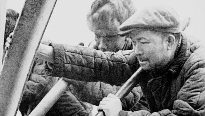 王进喜大步跨上钻台握住冰冷的刹把纵情高喊