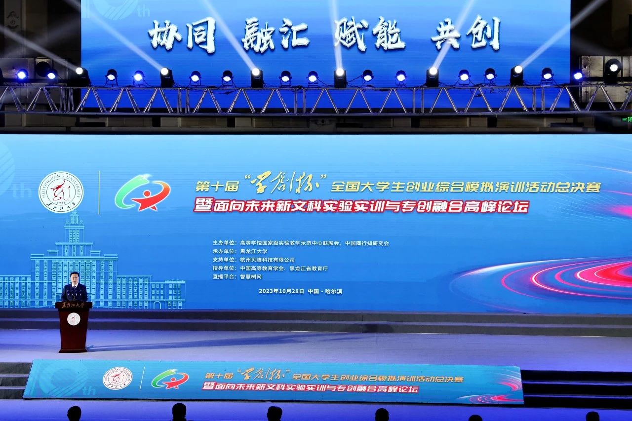黑龙江网讯(记者 徐楠)10月28日,由高等学校国家级实验教学示范中心联席会经管学科组、中国陶行知研究会主办,黑龙江大学承办的第十届“学创杯”全国大学生创业综合模拟演训活动全国总决赛在黑龙江大学体育馆举行。来自全国百余名专家学者,以及来自25个省份、218支团队进入全国总决赛,近千名师生齐聚黑龙江大学。大赛同期举办“面向未来新文科实验实训与专创融合高峰论坛”。会议全程由智慧树网提供云端直播,在线人数达到3053人。