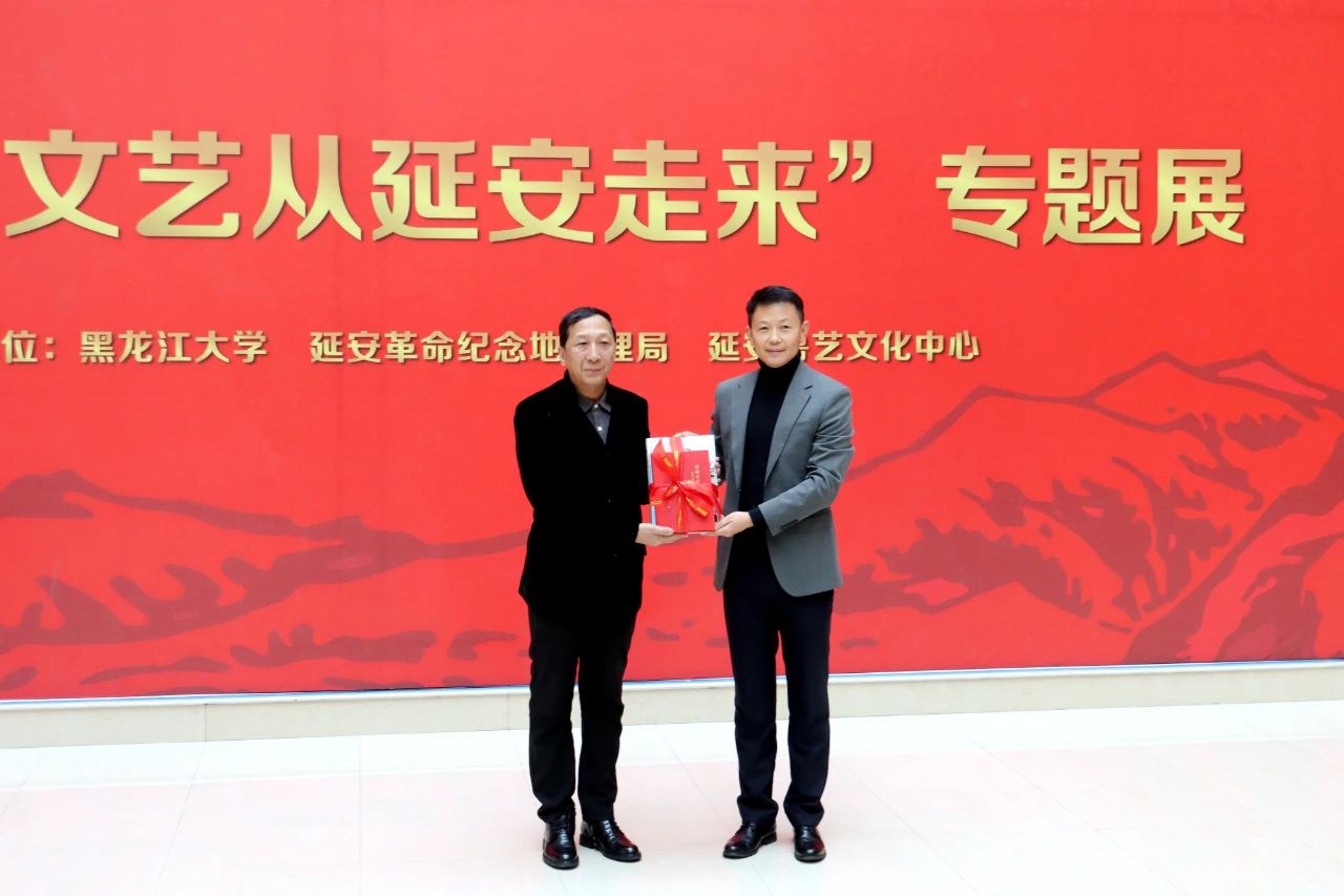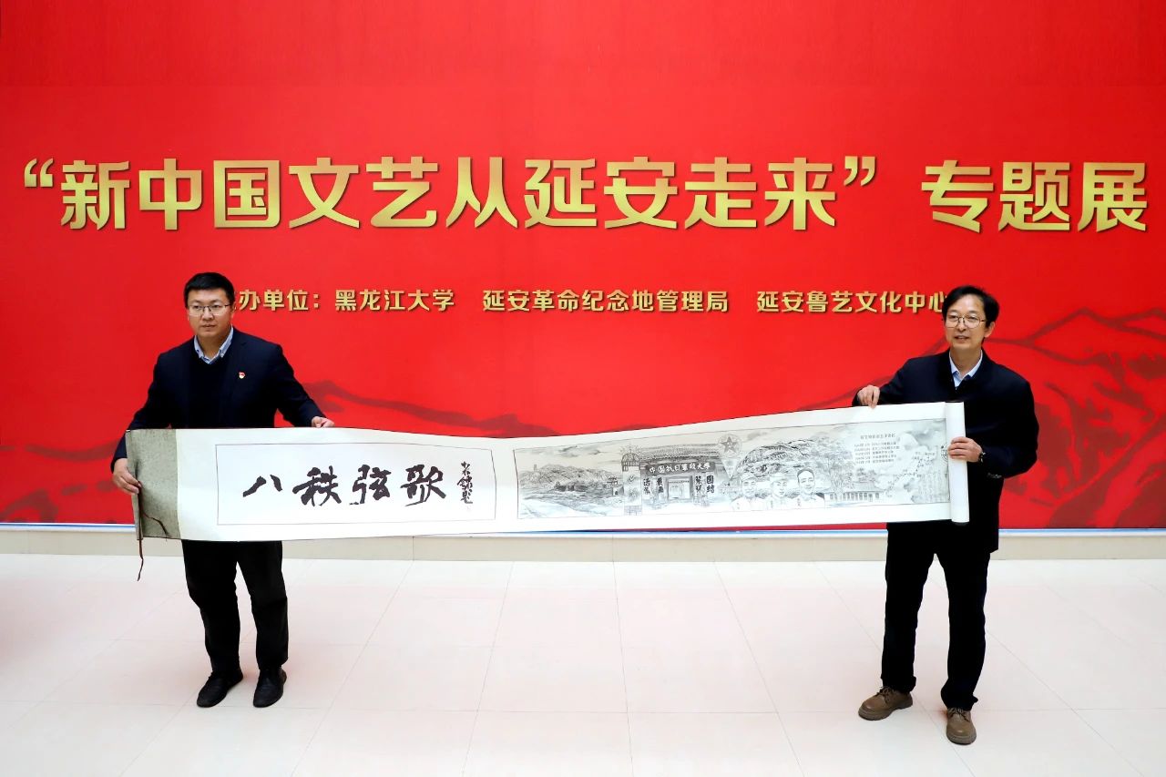 黑龙江大学党委常委、宣传部部长杨其滨向延安鲁艺文化中心赠送黑龙江大学八十周年校庆绢本水墨长卷《八秩弦歌》,延安鲁艺文化中心副主任王强接收长卷。