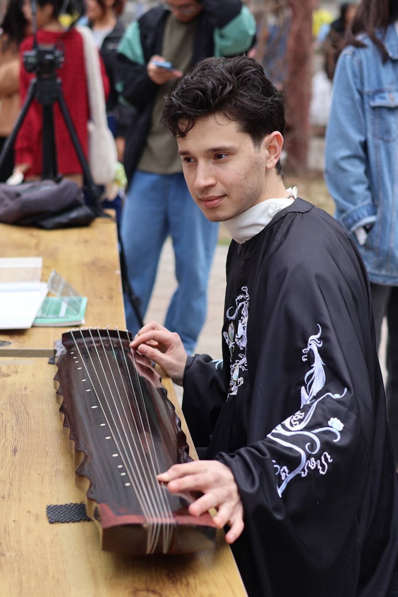 当天在书画展台展示书法的国际学院老师白方亮最受欢迎,他很高兴留学生们喜欢书法,“我平时就给留学生教授书画课,在国际中文日参加活动,也是希望能更好地宣传中国传统文化,促进各国学生文化交流。”水声学院2022级学生秦玮琪所在社团长殷汉服社也借国际中文日活动向同学们展示汉服,“希望大家能在活动中感受到传统文化的魅力。” 在活动上教留学生弹古琴的联合学院学生富子杰同样收获很多,“我感受到来自不同国家的外国友人具有各自鲜明的风土人情,了解到来自全世界各地的风俗习惯。”