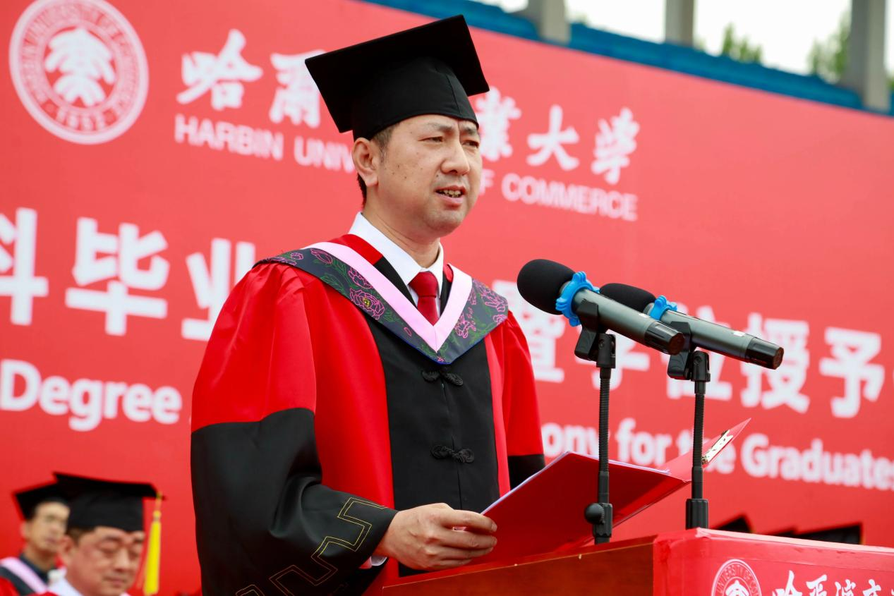 哈尔滨商业大学党委书记赵广以《怀揣梦想 勇毅前行》为题发表了热情洋溢的讲话。赵广代表学校向圆满完成学业的本科毕业生表示热烈祝贺,向辛勤付出的老师和家长致以敬意和感谢。赵广书记与毕业生们一起回顾了商大学子奋斗前进的点点滴滴和学校发展建设取得的成绩,并为学生们的成长成才感到骄傲。他寄语毕业生们,要胸怀理想,做有家国情怀的人;要勇于拼搏,做有担当作为的人;要终身学习,做有能力才干的人。并勉励全体毕业生树立敢为人先、敢于突破、敢试敢闯的创新思维,在实践中提高自己创新创造的能力。典礼上,毕业生代表,在校生代表,教师代表,校友代表依次发言,感谢学校的培养,一同祝愿毕业生们前程似锦。