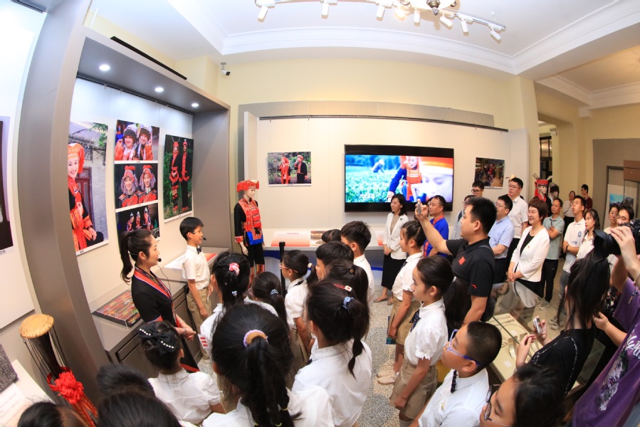 开幕式结束后,与会人员在讲解员的带领下参观了主题展、欣赏了歌舞表演,瑶族博物馆工作人员带领与会的哈工大附中小学部学生体验黄泥鼓绘制、刺绣香包制作等非遗互动文化项目。