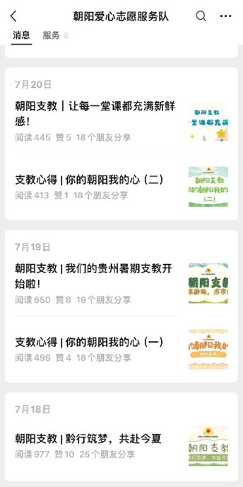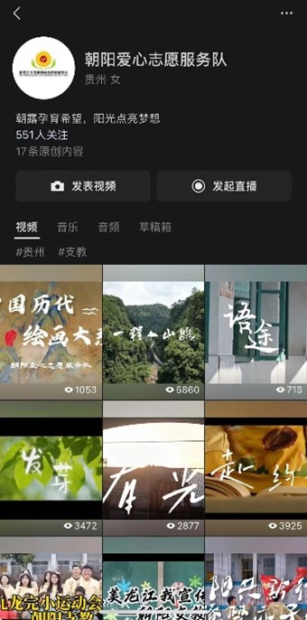 执手朝阳,牵梦远航。朝阳爱心志愿服务队利用公众号平台与视频号平台发布各类主题活动推送与主题活动视频,支教期间,服务队在公众号上发布推送共32篇,累计阅读量达1万余次;视频号上发布视频5条,视频播放总量达1.4万余次,点赞量达1500余次。其中,《一程山路》主题视频被“黑大青年”公众号转载报道。通过此次宣传,使更多人了解到了山区教育与山区留守儿童的真实情况,吸引社会力量广泛关注山区留守儿童,为乡村振兴注入新的希望与活力。