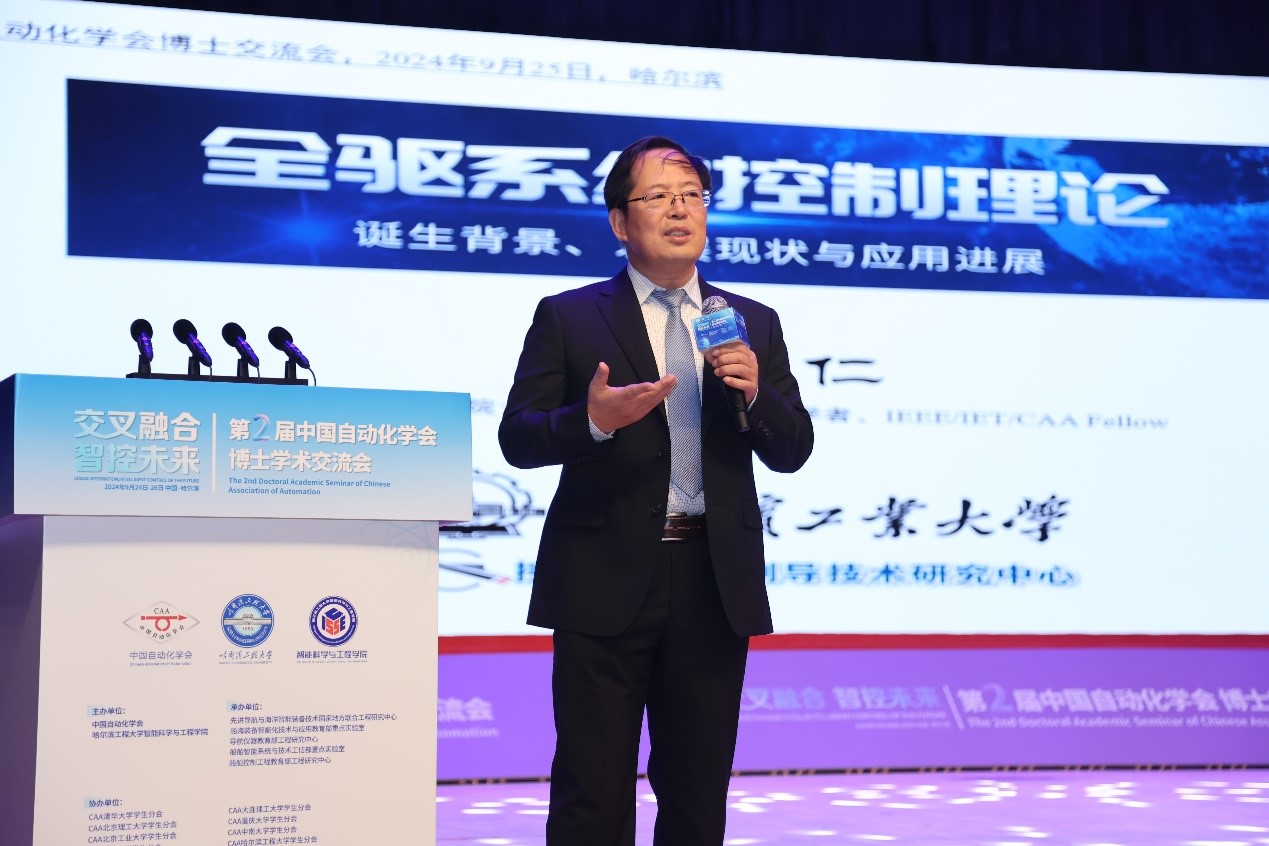 会议主旨报告环节,中国科学院段广仁院士作题为《全驱系统控制理论—诞生背景、发展现状及应用进展》的主旨报告,他从全驱系统方法的诞生背景、优越性和研究现状出发,介绍了全驱系统模型对原始系统的作用机理,并对全驱系统理论的学术成果及实际性应用展开具体介绍。