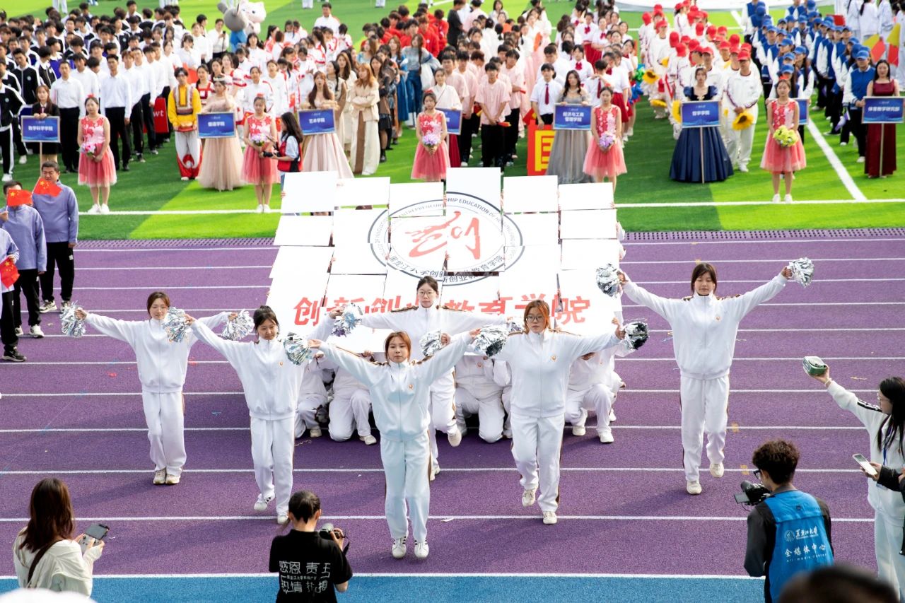 经济与工商管理学院舞狮领队欢跃前进,缤纷彩带交织于队列间,和平鸽向蓝天展翅高飞,寄托着对本届运动会的美好祝愿和祖国母亲的诚挚祝福。文学院代表队身着汉服,手持折扇,灵动翩跹,展现了中国传统文化的魅力。伴随着无人机彩烟划过天空,新闻传播学院代表队昂首阔步,手持横幅,口号声激昂豪迈,彰显了青春与活力。计算机与大数据学院(网络安全学院)代表队身姿挺拔,意气风发,充分体现着学院学子们砥砺前行的高昂斗志。尤其值得一提的是,今年,校友代表队首次参加运动会开幕式。