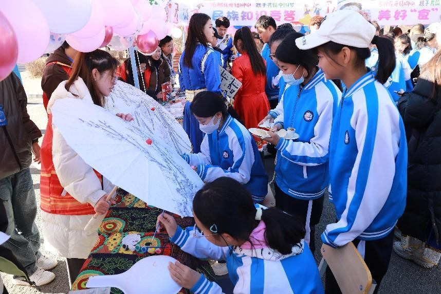 活动在歌曲《相亲相爱》的激昂旋律中拉开帷幕,舞蹈《美丽中国》、主题演讲《传承伟人精神 争做时代少年》等节目陆续登场,为校园民族文化节启幕营造了浓厚氛围。活动设置了民族手工艺展、民族手工制作坊、民族游戏体验、美好“食”光、民族特色服饰体验、民族生活物品展、民族知识竞答7个民族文化展示区,学生们身着民族传统服饰,邀请嘉宾、师生体验特色民族文化。此次活动还专门推出了“石榴花开结同心 携手共筑中国梦”主题民族文化书画展,书画展为期一周,供全校师生参观学习。