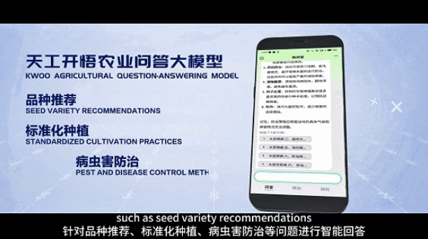 “天工开悟”农业大语言模型整合了农业领域的多源、多模知识,通过自动化方法抽取了作物表型、生长机理、农事操作等常识、经验与逻辑知识,建立了统一、共享的农业知识表示体系及大规模知识图谱。结合生成式AI大模型的认知能力,进一步研发了数据与知识联合驱动的农业问答大模型,针对品种推荐、标准化种植、病虫害防治等问题进行智能回答。此外,“天工开悟”生长大模型能够结合天气、土壤、管理等外部干预因素,实现水稻、玉米、大豆、小麦等24种作物、64个品种的高精度、长周期生长预测。