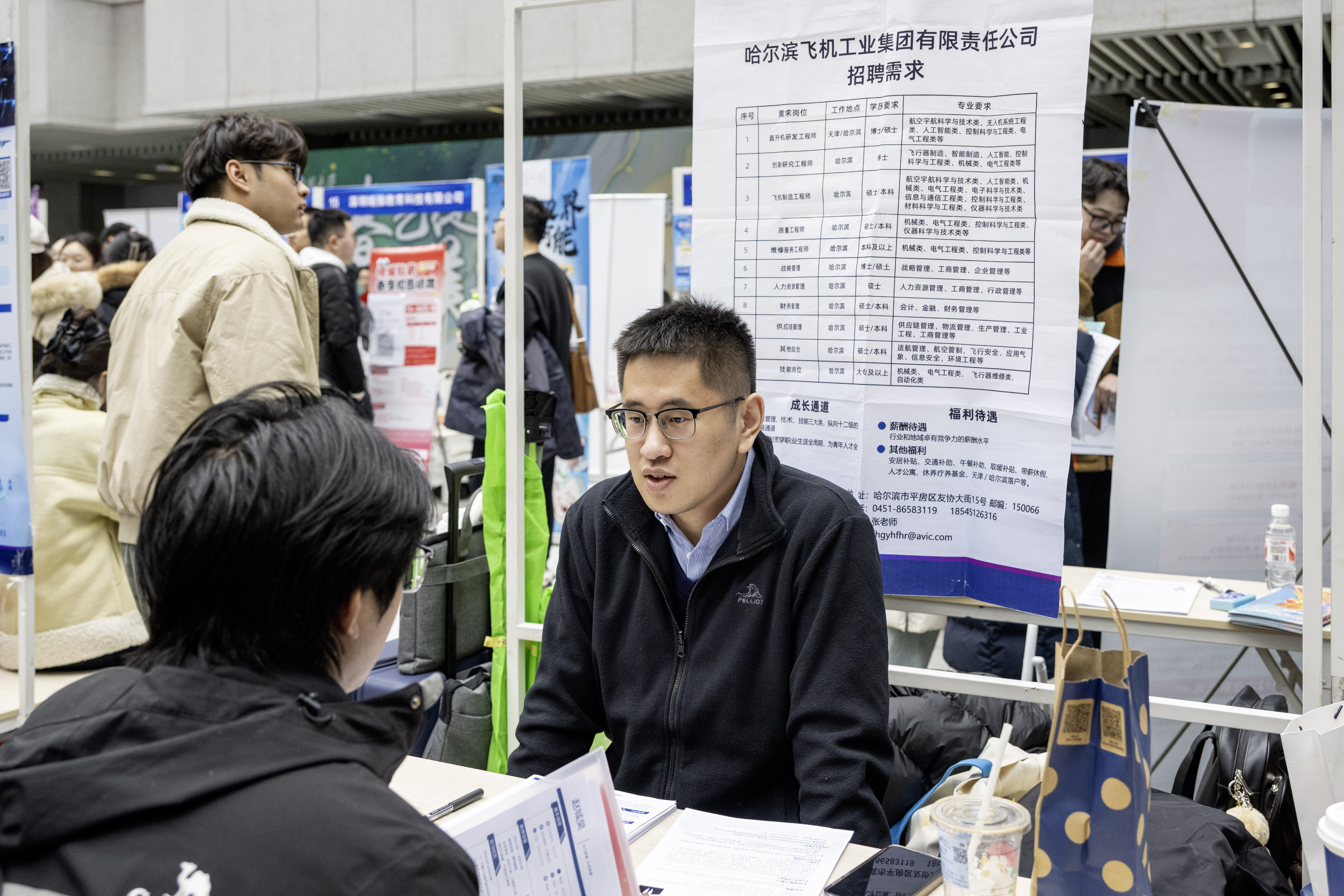 航建学院2022级硕士生邵晶是力学专业,她偏向选择航空工业领域的工作岗位:“刚上研一时,我就给自己设立了目标,想在毕业后投身国家重大工程、重大项目、重要领域就业。今天现场有很多相关的单位,我正在与两家有意向的企业洽谈,希望我能获得理想的岗位,为强国建设贡献自己的青春力量。”(图片由哈尔滨工程大学提供)