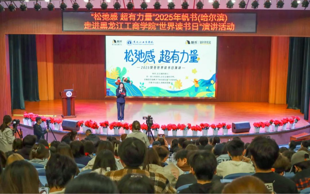 黑龙江网讯(记者 宋菲)4月23日晚,一场融合了数字阅读新风尚与经典文学深邃魅力的文化盛宴“松弛感 超有力量”帆书(哈尔滨)走进黑龙江工商学院“世界读书日”主题演讲活动,在黑龙江工商学院松北校区报告厅举行。