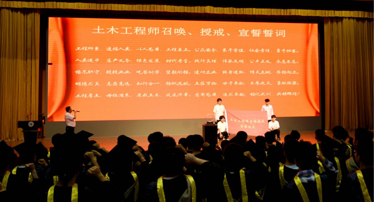 土木与建筑工程学院已连续举办十届工程师召唤授戒宣誓仪式,这一活动不仅是学院工程文化育人体系的重要组成部分,也是具有鲜明工程特色的思政大课。通过将工程伦理教育、职业责任传承与实践仪式相结合,学院持续培养未来工程师脚踏实地、精益求精的职业精神。如今,该仪式已成为土木与建筑工程学院极具影响力的品牌活动,激励着一届又一届毕业生在工程领域中砥砺前行,为国家的工程建设事业注入源源不断的新生力量,也为推动工程行业的健康发展贡献着独特的教育智慧与力量。