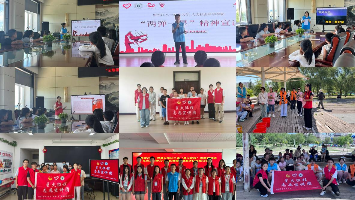2025年5月,团中央青年志愿者行动指导中心、中国核工业集团有限公司联合发布《关于遴选2025年全国大学生“两弹一星”精神志愿宣讲团的公告》,共遴选出1500支大学生“两弹一星”精神志愿宣讲服务团队,面向学校师生和社会公众等开展“两弹一星”精神志愿宣讲。其中黑龙江八一农垦大学人文社会科学学院社工连协会(简称社工连)“星火征程”志愿宣讲团,于7月15日-8月20日,走进各社区、企业,通过创新组织模式、优化内容设计、改进宣讲方式及拓宽传播渠道,构建起“有组织、分主题、广覆盖”的暑期社会实践格局,扎实推进宣讲活动。