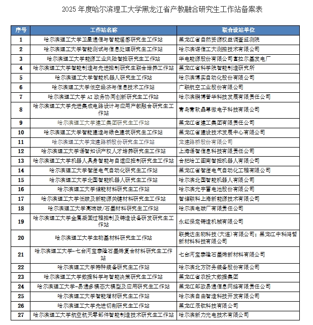 黑龙江网讯(于雷 记者 徐楠)近日,省教育厅公布了2025年度黑龙江省产教融合研究生工作站备案名单,哈尔滨理工大学申报的“哈尔滨理工大学卫星通信与智能遥感研究生工作站”等27个工作站全部获批。至此,学校近三年累计获批的省级产教融合研究生工作站数量已达57个,为学校进一步深化产教融合、精准对接产业需求、培养高层次实践创新人才提供了新平台。