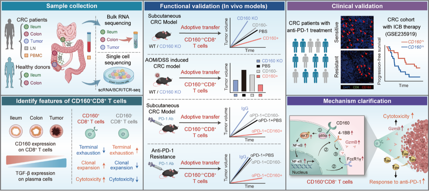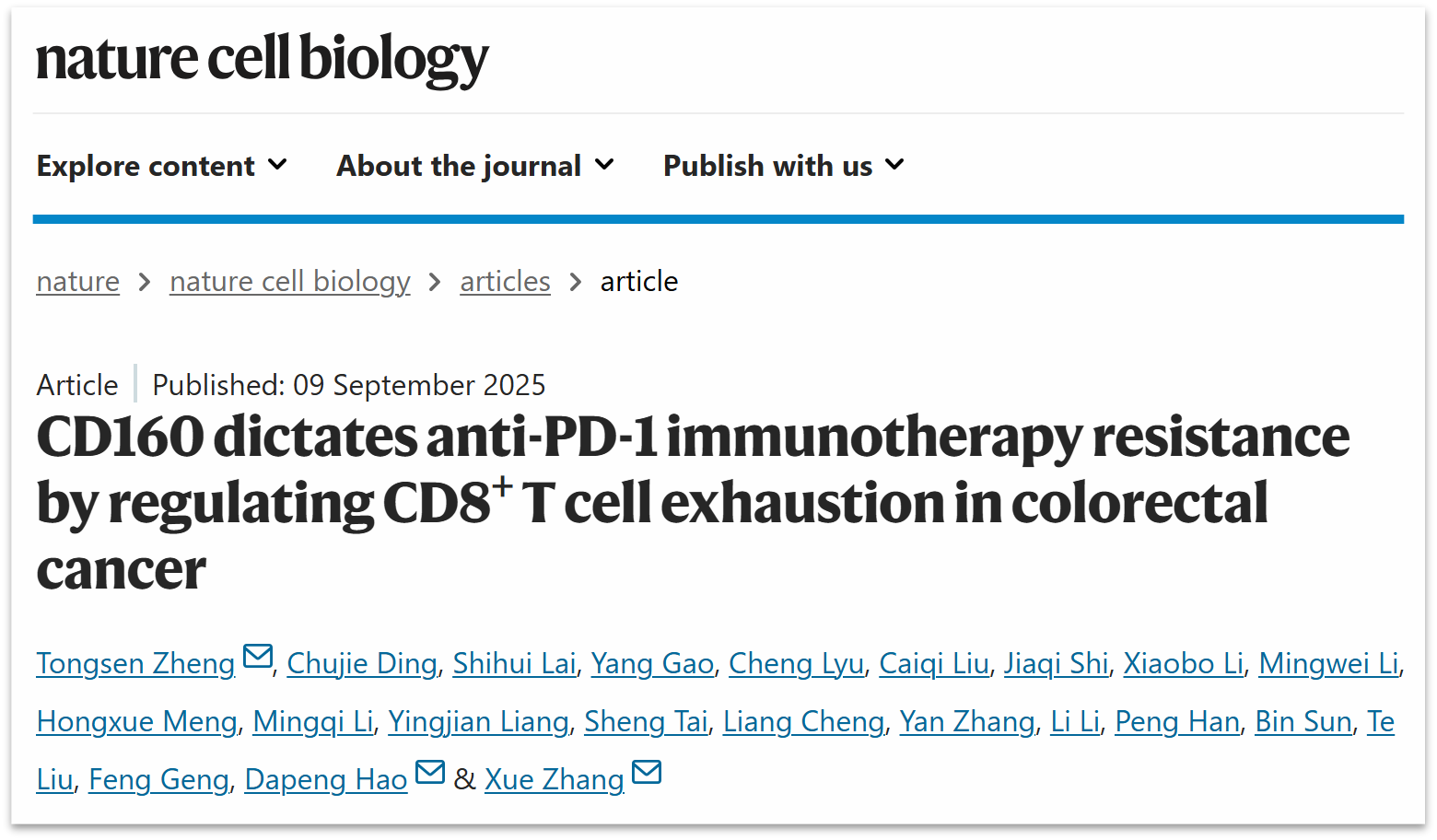 近日,哈尔滨医科大学“疾病基因及分子靶点创新研究”头雁团队的郑桐森-郝大鹏联合团队在肿瘤免疫治疗领域取得重要进展,研究论文《CD160 dictates anti-PD-1 immunotherapy resistance by regulating CD8+ T cell exhaustion in colorectal cancer》于9月9日在线发表(Nature Cell Biology,2025)。研究团队首次发现一种在回肠中特异富集的CD160+CD8+T细胞亚群兼具强大的抗肿瘤细胞毒性与抗终末耗竭功能,并能有效克服PD-1单抗治疗耐药,为肠癌患者提供了全新治疗策略。