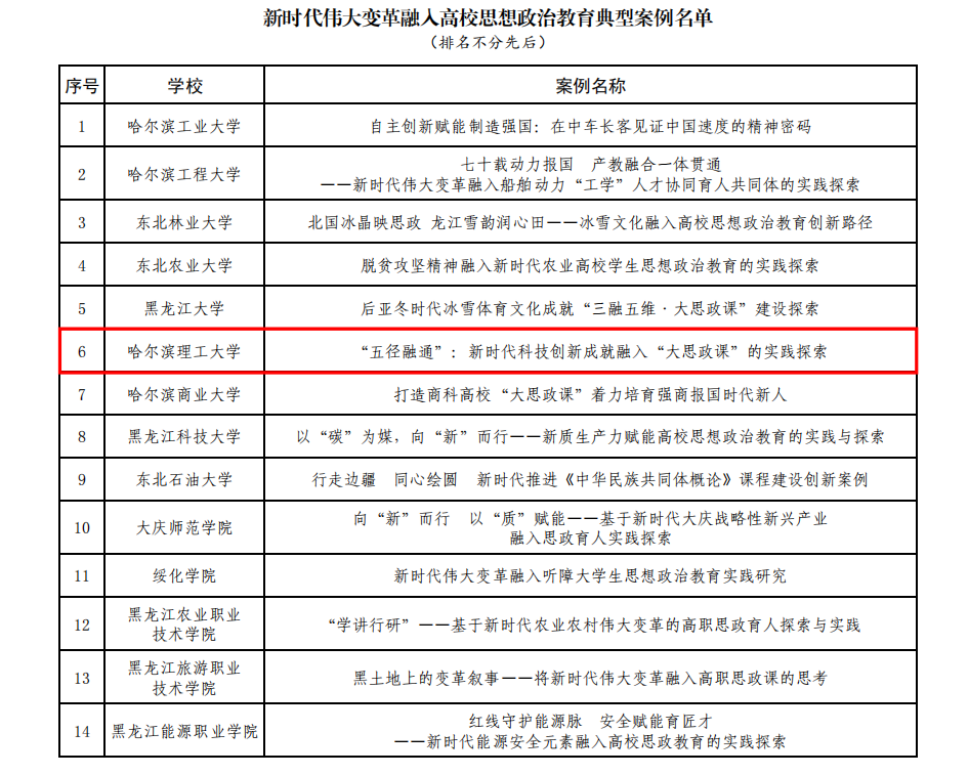黑龙江网讯(记者 徐楠)近日,黑龙江省教育厅公布2025年度“黑土铸魂”高校思想政治工作质量提升综合改革与精品建设项目入选名单,哈尔滨理工大学5个项目成功入选,入选项目数量居省内高校前列。