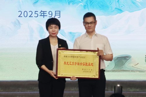 黑龙江大学党委副书记刘凤影代表学校向珠峰文化旅游创意产业园区授予“黑龙江大学社会实践基地”牌,标志着校地合作进一步深化,为学生提供更多实践机会,助力人才培养和产业发展。