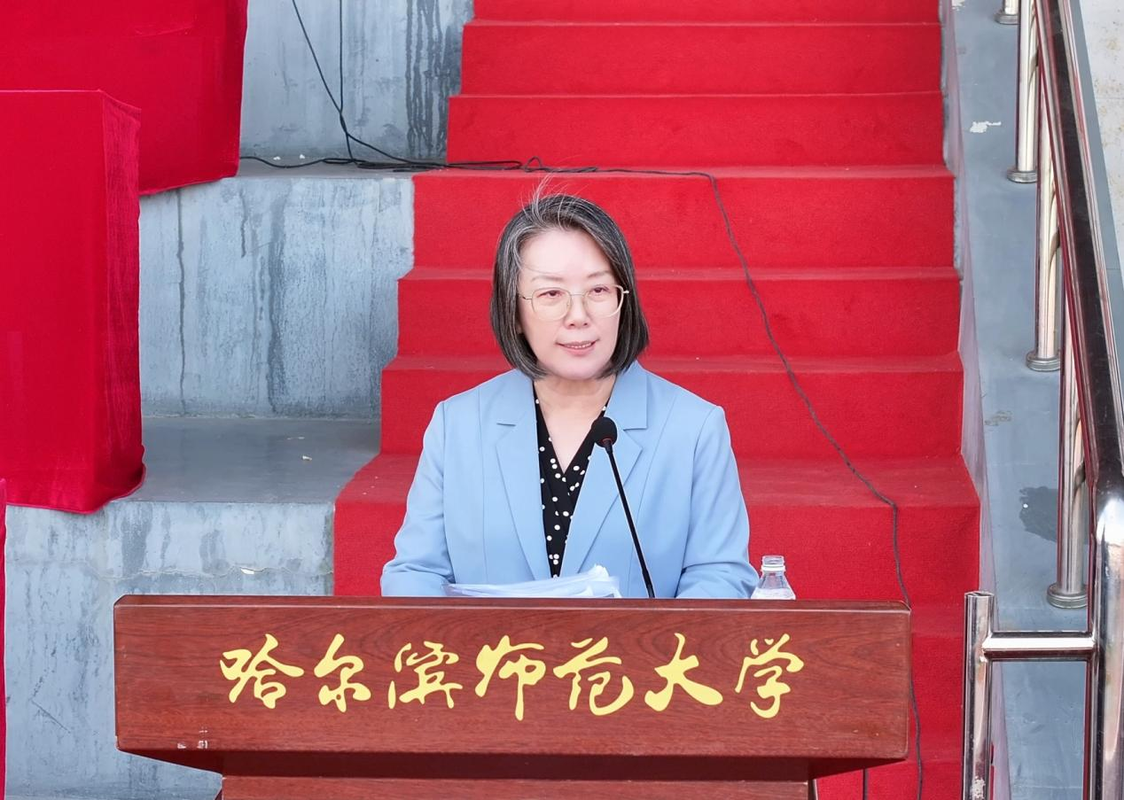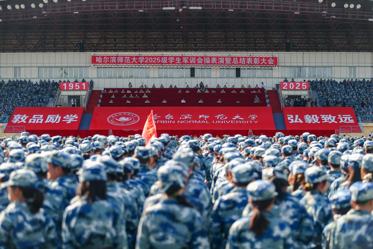 9月19日下午,哈尔滨师范大学2025级学生军训会操表演暨总结表彰大会现场,哈尔滨师范大学党委副书记、工会主席郭砾以“坚定政治信仰 肩负使命担当”为题,为新生讲授“国旗下的思政课”。