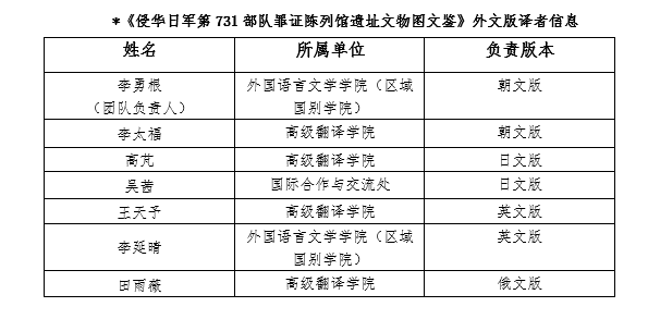 在纪念世界反法西斯战争暨中国人民抗日战争胜利80周年之际,应侵华日军第七三一部队罪证陈列馆与黑龙江朝鲜民族出版社的联合委托,由黑龙江大学外国语言文学学院(区域国别学院)李勇根老师担任项目负责人,联合高级翻译学院、国际合作与交流处等多部门组成的翻译团队,圆满完成《侵华日军第731部队罪证陈列馆遗址图文鉴》多语种版本的翻译工作。该丛书已由黑龙江朝鲜民族出版社正式出版,并成功入选“2025年度黑龙江省精品出版工程与优秀学术著作项目”。这一成果标志着黑龙江大学在服务国家战略、推动国际传播与史学研究融合方面取得重要进展。