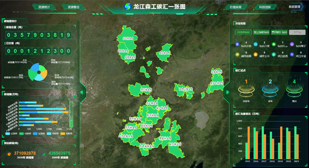 项目的技术探索始终与国家战略同频共振。为服务“双碳”目标,团队研发的“双碳”绿色发展平台,为龙江森工碳资产公司实现了林业碳汇项目从基线调查、碳储量计算到项目申报、监测核查的全链条数字化管理。以往需要3个月才能完成的碳汇项目设计文件,如今通过平台仅需几分钟即可完成,效率大幅提升,为我国林业碳汇资源开发提供了技术支撑。