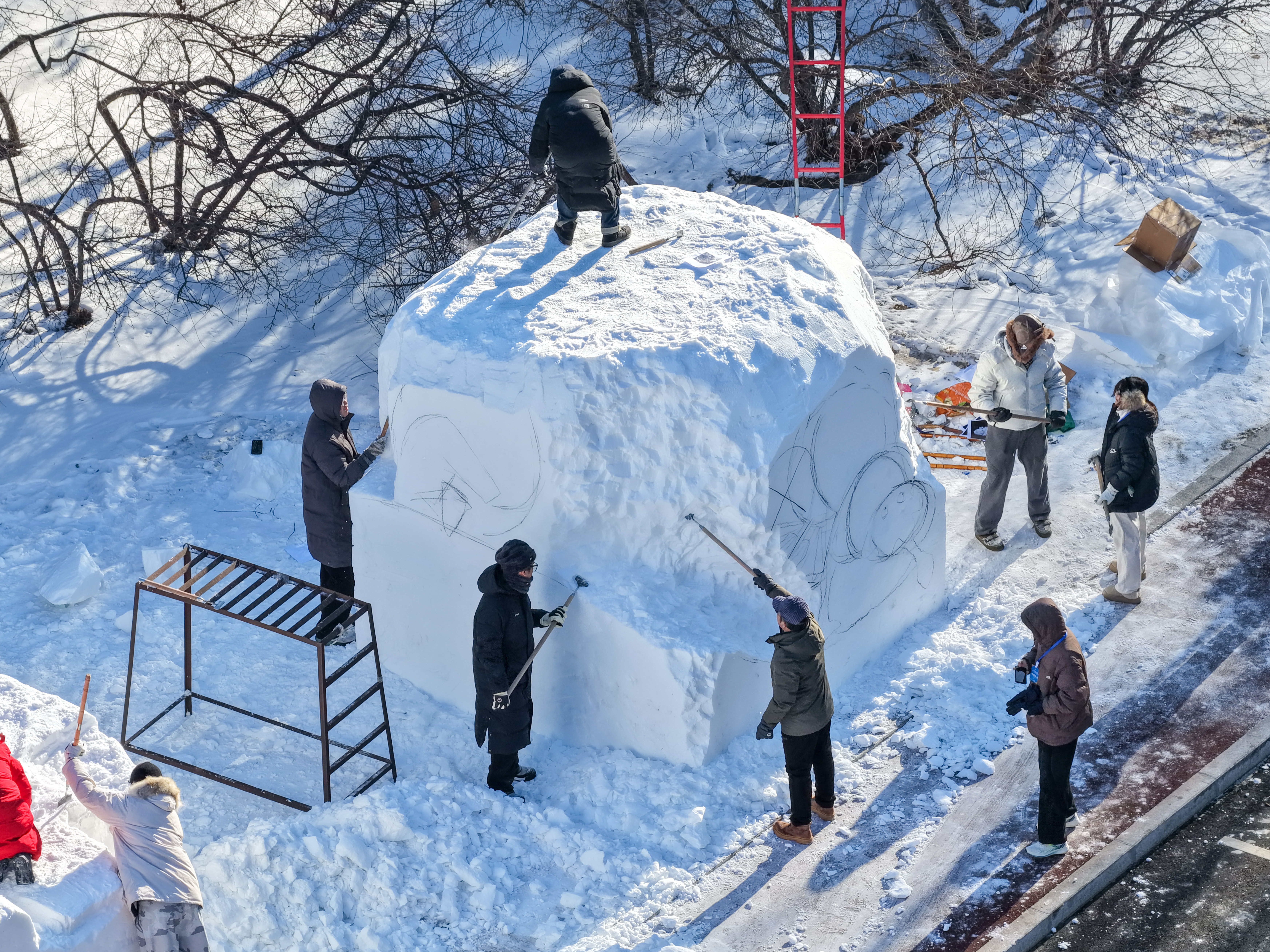 上午八点,大赛正式“开铲”。来自世界各地的青年“雪雕艺术家”齐聚赛场,围绕一方方雪块展开创作。刹那间,铲起雪扬,锯声沙沙,刀尖轻舞,安静的雪场化作一片热情洋溢的创作海洋。梯架之上,有人挥大刀阔斧勾勒轮廓,雪屑如雾飘洒;雪块之侧,有人俯身精雕,专注刻画细微纹理。还有队员围在一起,对着设计图低声讨论。寒风中,他们呼出的白气与飞扬的雪屑交织在一起,冻红的脸颊上却目光炯炯,手中工具与冰雪的每一次碰撞,都在诉说专注与热忱。
